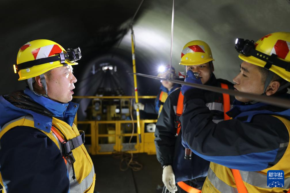 春運期間,接觸網(wǎng)工人劉海軍(左)和王有壽(右)在拉林鐵路色拉丘隧道內(nèi)為接觸網(wǎng)加固吊弦。(拉巴次仁攝)