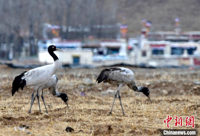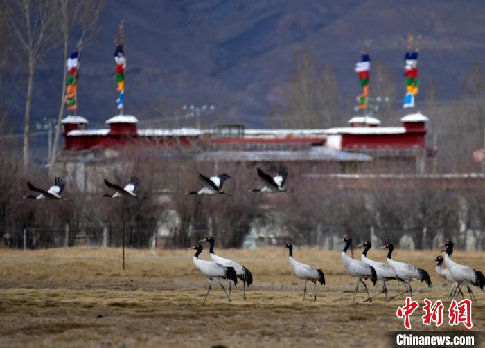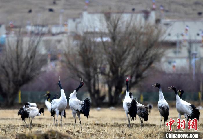 黑頸鶴是全球十五種鶴類中唯一在高原地區(qū)繁殖和越冬的鶴類,被譽為“高原神鳥”,屬中國國家一級保護(hù)動物。每年10月中下旬左右,黑頸鶴陸續(xù)飛抵雅魯藏布江中游河谷等地越冬。圖為3月8日,西藏拉薩林周縣黑頸鶴保護(hù)區(qū),黑頸鶴在田間覓食、嬉戲。中新社記者 李林 攝