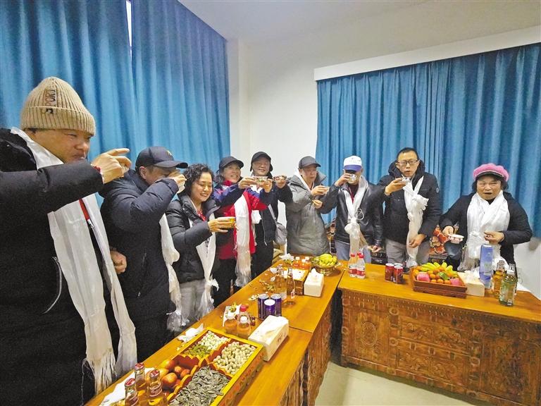 “古突”之夜,“走進(jìn)雪域邊陲 體驗(yàn)藏歷新年”旅游團(tuán)游客在玉麥以酥油茶代酒,祝賀藏歷新年,祝福祖國繁榮昌盛?! ?/p>