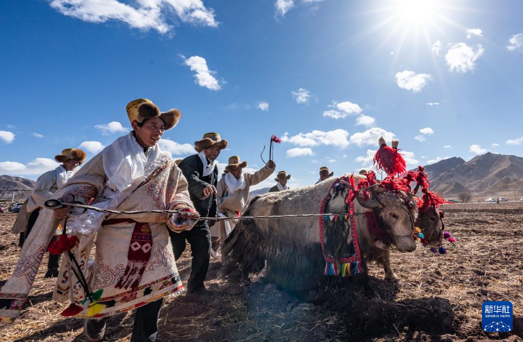 3月16日,在拉薩市林周縣春堆鄉(xiāng)春耕典禮上,農(nóng)民沿襲傳統(tǒng),使用“二牛抬杠”的方式翻土犁地。新華社記者 丁增尼達 攝