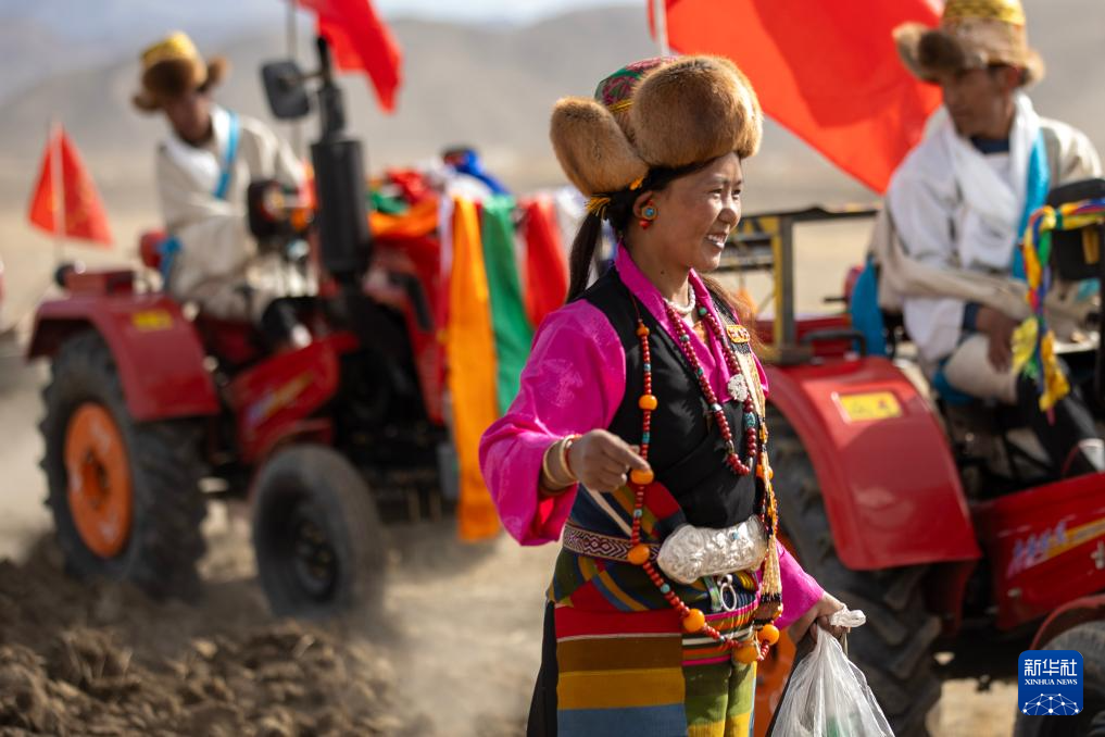 儀式現(xiàn)場,38臺農(nóng)用拖拉機(jī)整齊停放。11時許,在眾人的祈福聲中,清一色身著白色氆氌藏裝、頭戴長壽金絲帽的拖拉機(jī)手把拖拉機(jī)開進(jìn)農(nóng)田,機(jī)身后掛的銀色犁頭刨開沉睡了一整個寒冬的沃土,盛裝的婦女們緊隨拖拉機(jī),播撒希望的種子。