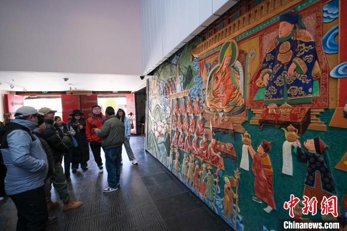 3月18日,游客在布達(dá)拉宮珍寶館參觀五世達(dá)賴(lài)?yán)锏奖本┯P見(jiàn)順治皇帝的浮雕。中新社記者 江飛波 攝