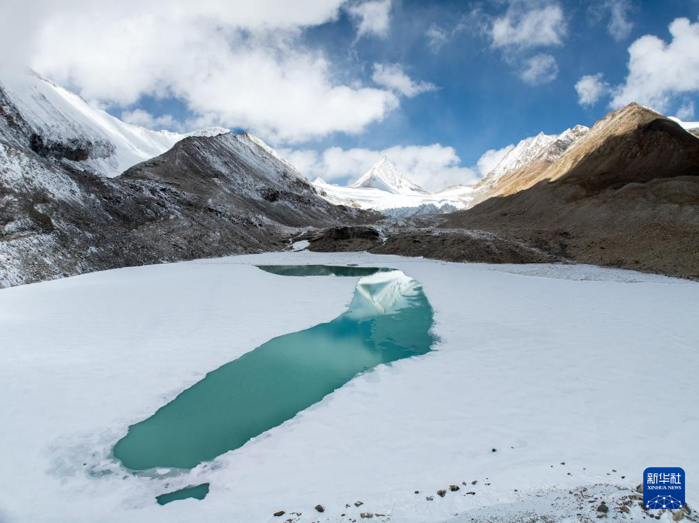 4月13日拍攝的普拉喜瓊峰腳下的曲隆嘎木措冰川湖(無人機(jī)照片)。新華社發(fā)(董志雄攝)
