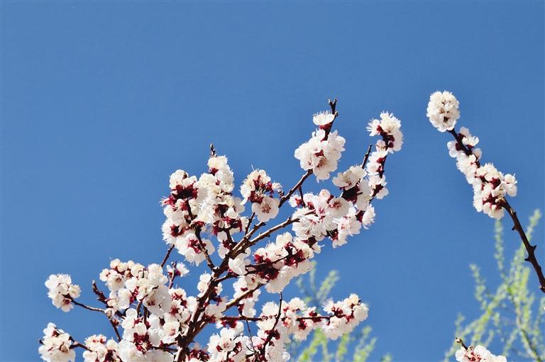 路邊的榆葉梅率先吐蕊,粉白的花朵簇擁在枝頭,遠看如粉白的云朵飄浮在街道兩側(cè)。沿著道路慢慢走,幾株桃樹穿插在其中,深紅淺粉交錯,以藍天為背景,舉起手機隨手一拍都是高清壁紙級別的美景。陽光正好時,能看到在花樹下曬太陽的老奶奶,她們?yōu)檫@浪漫的春日景色增添了一絲生活的氣息。