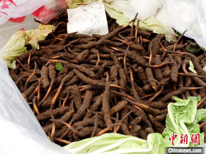 5月7日,青海玖鷹蟲(chóng)草市場(chǎng)內(nèi),商戶用白菜葉片為冬蟲(chóng)夏草鮮草保鮮。李雋 攝