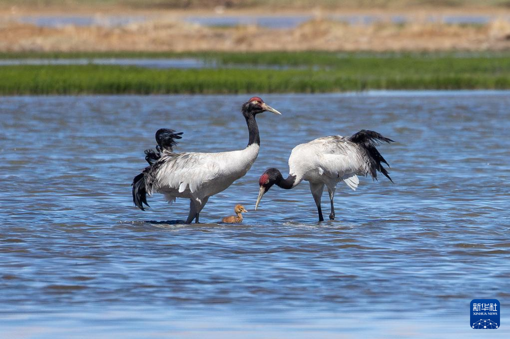 2024年6月9日,一對(duì)黑頸鶴帶著雛鳥在西藏那曲市申扎縣一處濕地棲息、覓食。新華社記者 旦增尼瑪曲珠 攝