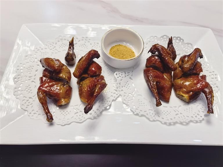 除了閩菜,會館還推出了創(chuàng)新版川菜和地道粵菜?;洸酥凶钪档闷穱L的便是店內(nèi)的招牌菜之一——廣式深井燒鵝。深井燒鵝是粵菜的經(jīng)典燒臘,其皮脆肉嫩、脂香濃郁,琥珀色脆皮淋上焦香的蜜汁,堪稱一絕。一口咬下,燒鵝的脆皮在口中“咔嚓”作響,肥瘦相間的鵝肉滿口留香,用傳統(tǒng)荔枝木或棗木炭烤的燒鵝還能嘗出淡淡的煙熏香,配以酸梅醬,解膩開胃,鮮美無比。
