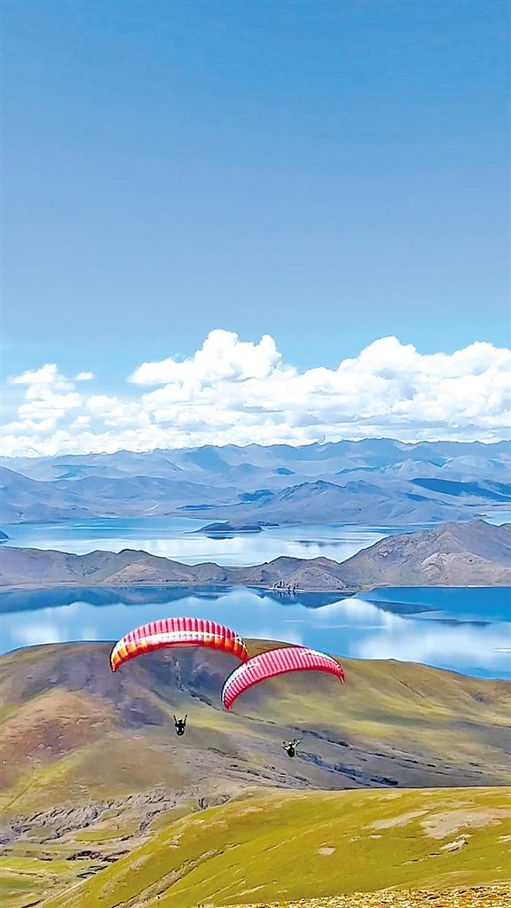 5月,午后的羊卓雍錯(cuò)(以下簡(jiǎn)稱羊湖)別具魅力。在海拔大約5000米的山頂上,經(jīng)過一番準(zhǔn)備,來自深圳的游客朱先生跟隨教練口令向懸崖邊沖去?;鑲惚粴饬魍信e著騰空而起,劃出一道優(yōu)美的弧線,像雄鷹一樣翱翔在波光粼粼的湖面上,最后飄然降落在湖邊……