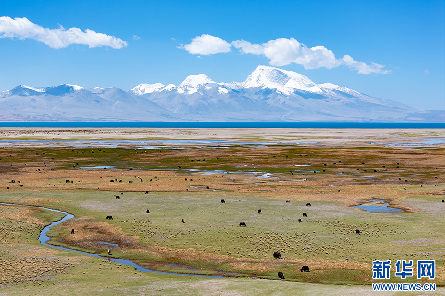 遠(yuǎn)處的瑪旁雍錯與濕地內(nèi)覓草的牦牛(6月9日攝,無人機(jī)照片)。新華網(wǎng) 旦增努布 攝