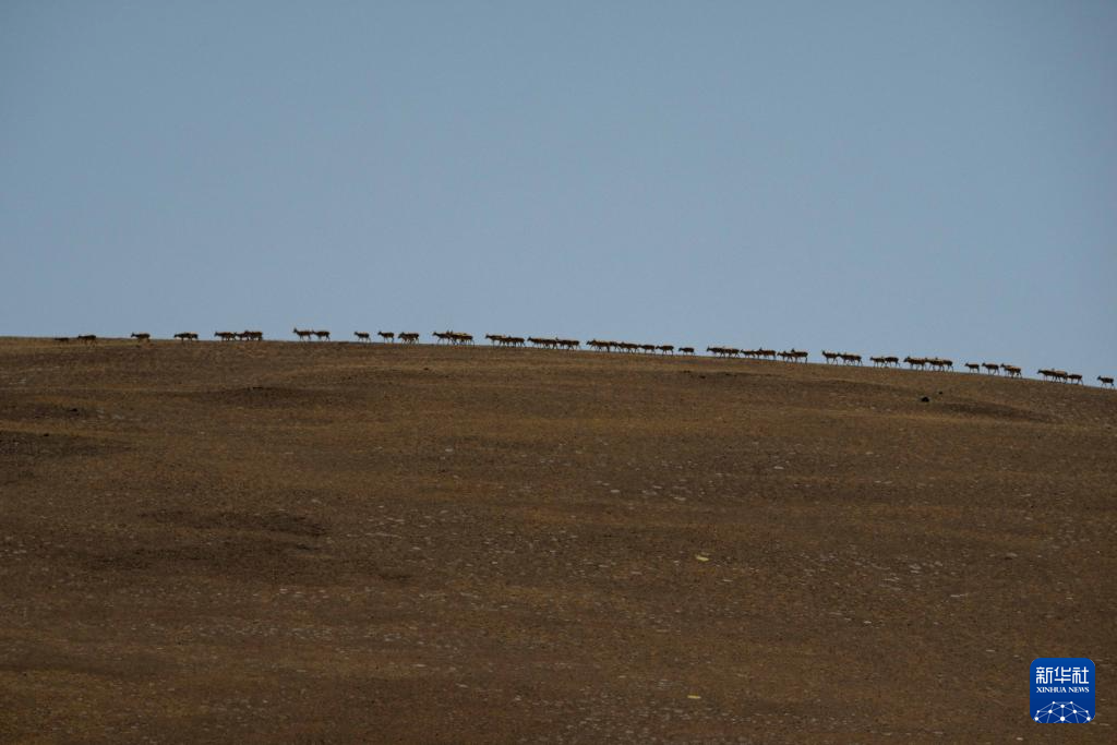 在羌塘國(guó)家級(jí)自然保護(hù)區(qū)核心區(qū)拍攝的遷徙中的雌藏羚羊群(6月9日攝)。新華社記者 旦增尼瑪曲珠 攝 ??