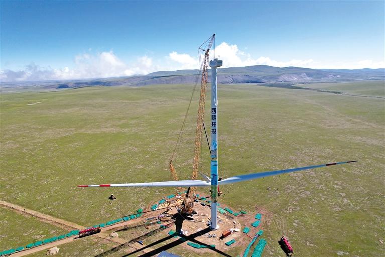 圖為西藏開投色尼區(qū)曲果嘎姆200MW風(fēng)電項(xiàng)目首臺風(fēng)電機(jī)組吊裝現(xiàn)場。周俊 李梅英 攝