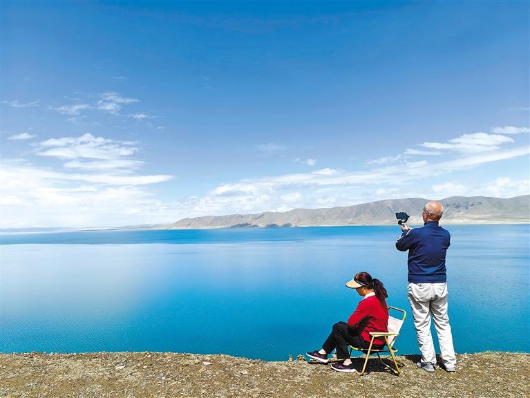 圖為游客在班戈縣巴木錯觀賞風(fēng)光。記者 趙書彬 汪純 攝