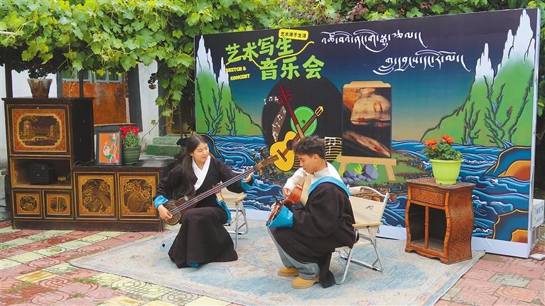 在音樂鑒賞環(huán)節(jié),拓崗扎念樂隊(duì)將傳統(tǒng)扎念琴演奏與現(xiàn)代音樂結(jié)合,表演了《卓木仁青崗》等曲目;青年歌手次仁羅布演唱藏族民歌,展現(xiàn)非遺特色。在藝術(shù)對(duì)談中,青年畫家雍忠卓瑪分享了自己克服身體障礙堅(jiān)持創(chuàng)作的經(jīng)歷,圍繞“自然與藝術(shù)的關(guān)系”展開討論,結(jié)合作品從藏族文化和鄉(xiāng)土景觀中獲取創(chuàng)作靈感的過程。在寫生體驗(yàn)環(huán)節(jié),活動(dòng)參與者以德慶鎮(zhèn)民居和周邊自然景色為素材進(jìn)行創(chuàng)作,雍忠卓瑪從構(gòu)圖、色彩運(yùn)用等方面給予指導(dǎo),幫助活動(dòng)參與者完成10余幅繪畫作品。
