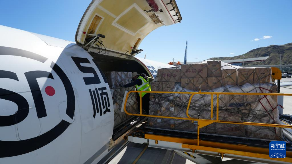 7月10日12點(diǎn)10分,一架載著西藏山南市瓊結(jié)縣小西紅柿、宏農(nóng)藏雞蛋,扎囊縣菜籽油、青稞等農(nóng)特產(chǎn)品的順豐全貨機(jī)從拉薩貢嘎國際機(jī)場起飛,前往湖北省鄂州市,這標(biāo)志著西藏首條貨機(jī)定期航線正式開通。一條連接西藏與華中地區(qū)的“空中金橋”由此貫通。