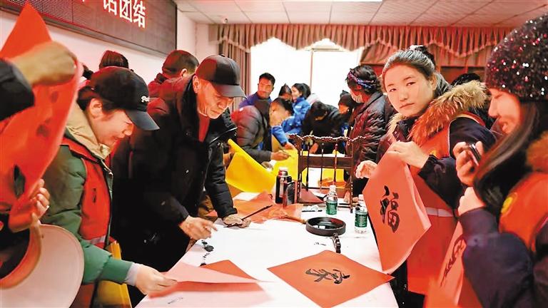 加查縣新時代文明實踐中心開展“鬧元宵 話團結”活動,志愿者們與群眾一同用毛筆書寫美好寄語。