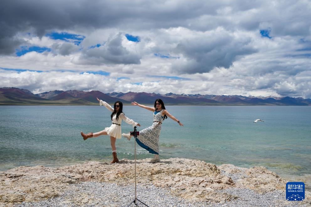 7月16日,兩名游客在納木錯湖邊自拍。新華社記者 晉美多吉 攝 ??