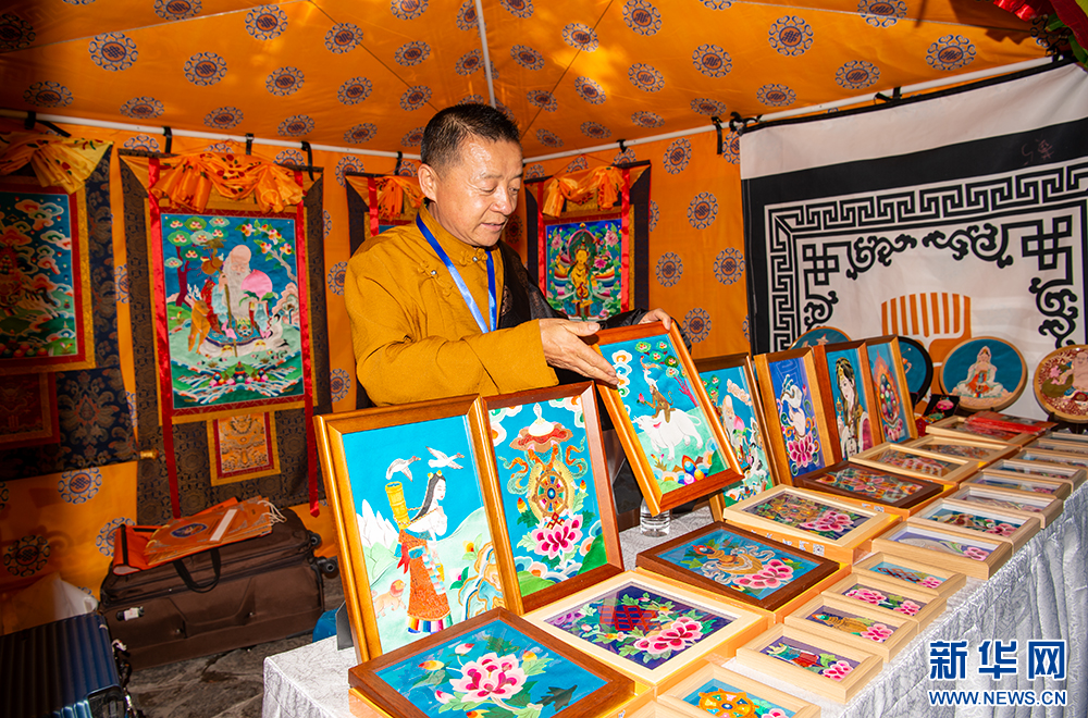 7月26日,來自青海的熱貢藝術(shù)(堆繡)代表性傳承人夏吾當(dāng)周在介紹特色文創(chuàng)產(chǎn)品。新華網(wǎng) 旦增努布 攝