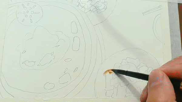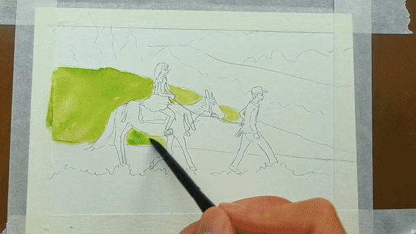 展開畫紙,最先捕捉到的是夏日魯朗層次豐富的綠意:嫩綠的草地鋪展開來,湖水映出清澈的藍(lán)綠色澤,遠(yuǎn)處的山巒泛著淡淡青色,層層疊疊。道路在明媚的陽光下,潔白如雪,在綠色中蜿蜒,串聯(lián)起一個個藏式村落。