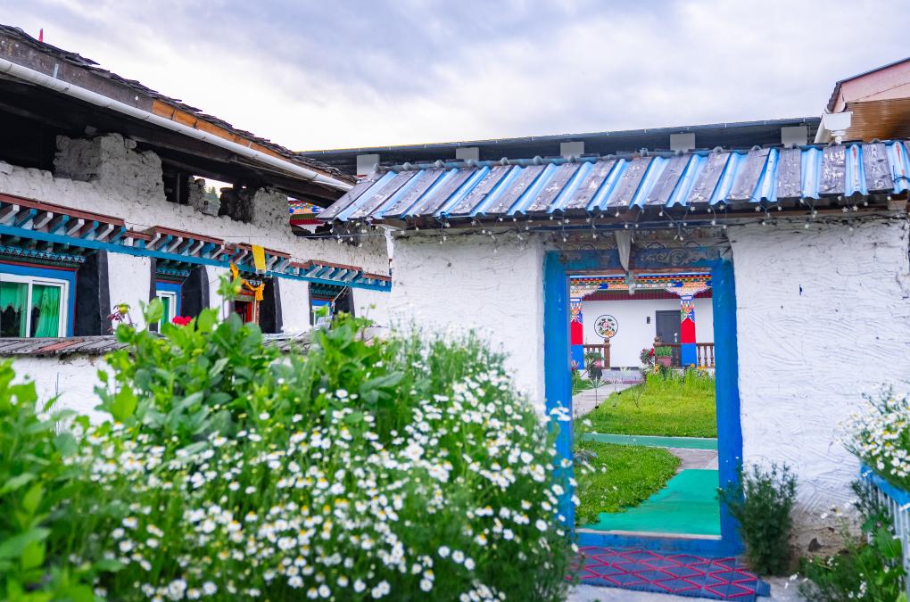 旦增家的藏式民宿門前種滿了鮮花。新華社記者 丁增尼達(dá) 攝