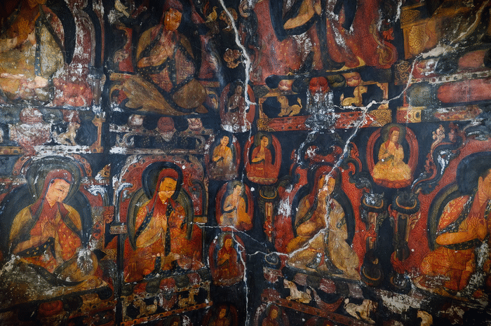 “你們看,這些壁畫顏色多鮮亮,千年不褪色!因?yàn)橛玫娜堑V石做的顏料?!睋?jù)仁增旺扎介紹,皮央石窟分布于前山與后山,石窟數(shù)量接近千座,其中5座內(nèi)繪有壁畫。有研究表明,這里出土的鎧甲片、戰(zhàn)刀等文物,與古格遺址中的同類器物高度相似,皮央石窟在千年前或曾是古格王國(guó)的一處重要方城。