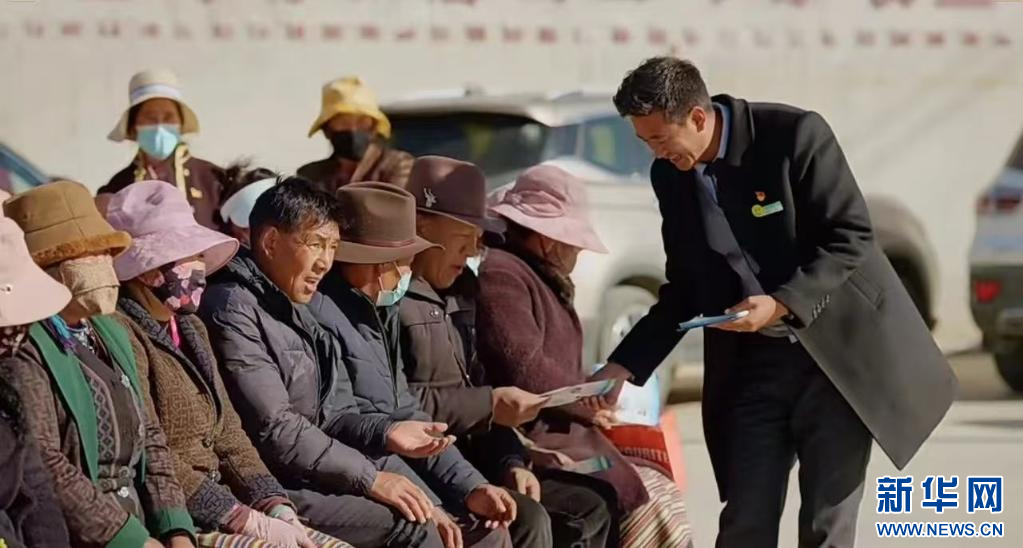 ??工作人員阿旺旦增為扎洞村群眾宣講金融知識,并介紹“庭院經濟貸”相關業(yè)務。(中國農業(yè)銀行股份有限公司山南分行供圖)