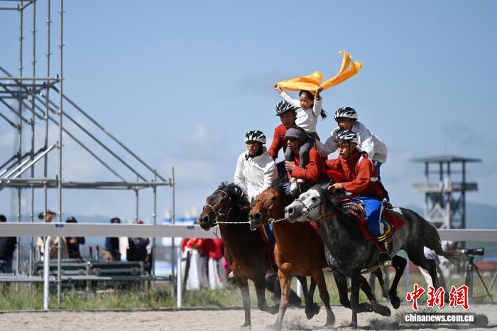 8月13日,九色甘南香巴拉·瑪曲第十六屆格薩爾賽馬會(huì)在甘肅甘南藏族自治州瑪曲縣格薩爾賽馬中心開幕。來自貴州、西藏、青海、四川、甘肅等省區(qū)的45支參賽隊(duì)962匹駿馬在瑪曲草原上展開為期5天的角逐。圖為開幕式現(xiàn)場(chǎng)馬術(shù)表演。中新社記者 九美旦增 攝