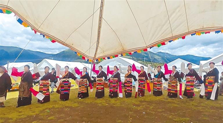 據(jù)了解,“耍壩子”活動是芒康縣及周邊地區(qū)藏族群眾的傳統(tǒng)民俗活動,是在豐收或節(jié)慶時舉辦的集體狂歡,融合歌舞、賽馬等元素,具有鮮明的地域文化特色和豐富的社會意義?;顒訄龅囟噙x在草原或高山草甸,參與者身著傳統(tǒng)服飾,圍成圓圈載歌載舞。近年來,“耍壩子”活動在傳承中創(chuàng)新,融入了不少新內(nèi)容。如,增加了賽馬、跑步、抱石頭等競技性兼具娛樂性的項目,并對活動進行直播,推廣傳統(tǒng)文化等。如今,該項活動作為游客體驗的重要內(nèi)容,已逐漸成為芒康縣拉動地方旅游經(jīng)濟的重要力量。