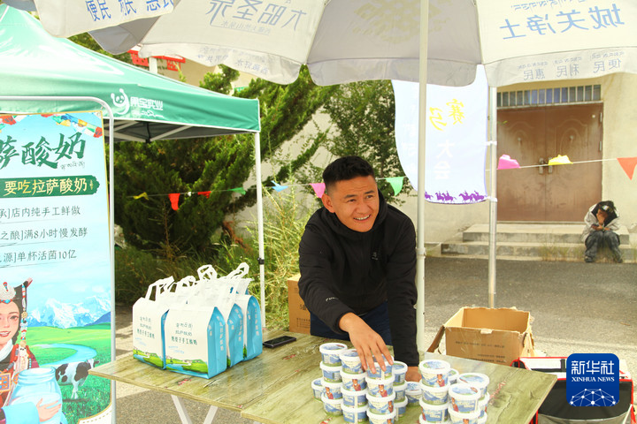 8月24日,旦增強(qiáng)巴正向游客介紹酸奶。新華社記者 潘一景 攝