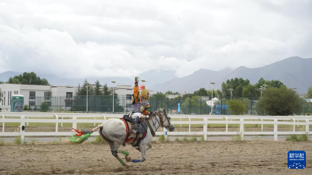 8月24日,西藏自治區(qū)馬術(shù)隊(duì)隊(duì)員旦增尼瑪在進(jìn)行“馬上敬酒”表演。 新華社記者 黃耀漫 攝