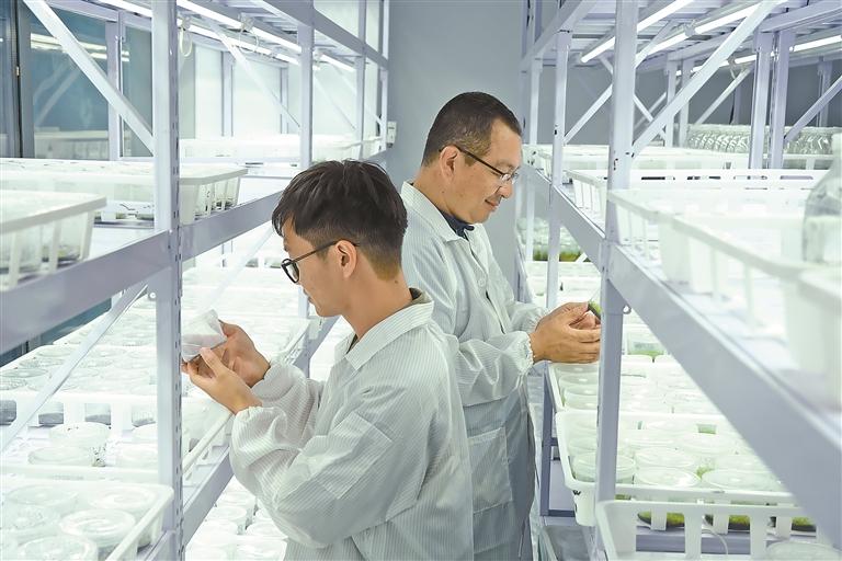 圖為基地工作人員正在檢查組織培養(yǎng)瓶里植物的長(zhǎng)勢(shì)。