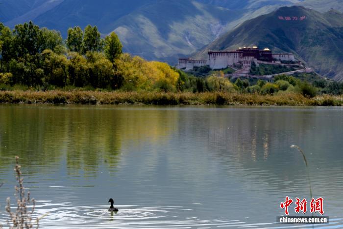9月4日,初秋時節(jié)的西藏拉薩市拉魯濕地國家級自然保護區(qū)秋意漸濃、景色如畫。藍天白云下,草木黃綠、水鳥嬉戲,與遠處的城市建筑共同構(gòu)成一幅美麗的生態(tài)畫卷。中新社記者 李林 攝