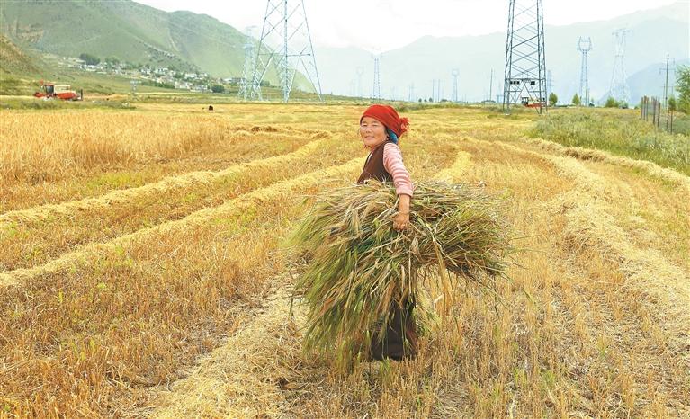 圖為該縣唐加鄉(xiāng)卓村村民在使用機(jī)械收割,并進(jìn)行青稞裝袋。記者 格桑倫珠 攝