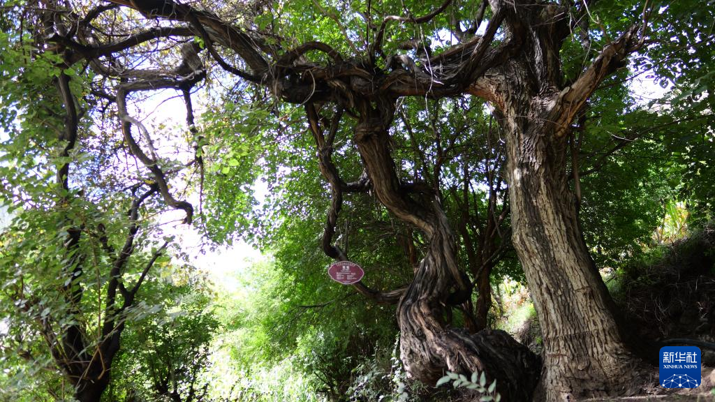 這是9月12日拍攝的左貢縣繞金鄉(xiāng)左巴村野生古葡萄樹(shù)(左),樹(shù)齡達(dá)416年。新華社記者 格桑朗杰 攝