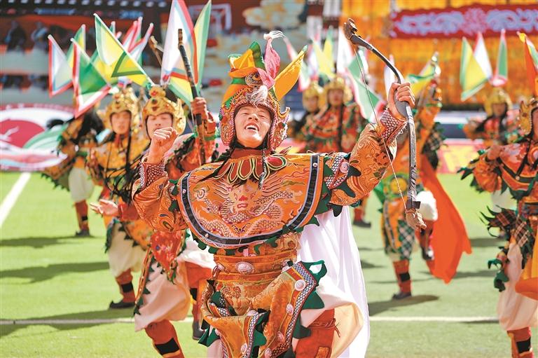 9月15日舉行的第十一屆三江茶馬文化藝術(shù)節(jié)開幕式上,來自昌都11個(gè)縣(區(qū))的群眾代表組成游行方隊(duì),載歌載舞,繞場一周,熱烈激昂的丁青熱巴、豪邁威武的類烏齊嶺卓舞、優(yōu)美歡快的芒康弦子等非遺舞蹈,向現(xiàn)場的干部群眾和各界來賓展示了昌都獨(dú)特的傳統(tǒng)文化和熱情好客的真摯情誼。隨后的文藝表演以歌舞和情景劇的形式,從金沙江的紅色記憶,到怒江的文化傳承,再到瀾滄江的高質(zhì)量發(fā)展之光,描摹出了昌都?xì)v史文化的主要脈絡(luò)和經(jīng)濟(jì)社會(huì)發(fā)展取得的巨大成就,為現(xiàn)場觀眾奉獻(xiàn)了一場難忘的文藝盛宴。