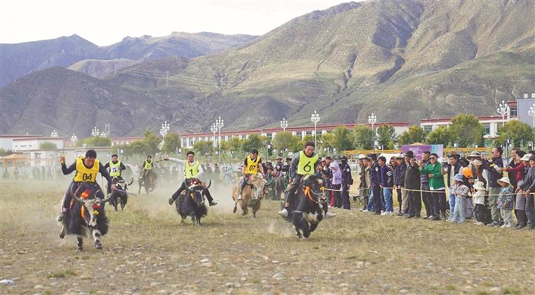 10月1日,拉薩市墨竹工卡縣賽牛場舉辦獨具特色的牦牛競速賽,為游客和群眾呈現(xiàn)了一場力量與速度的較量。圖為激烈的比賽現(xiàn)場。記者 格桑倫珠 攝
