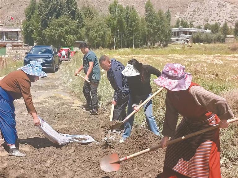 圖為山南市商務局駐村工作隊隊員和村民一起修整田間道路,方便人員和車輛通行。