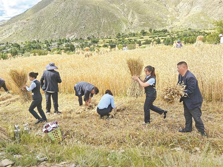 圖為農(nóng)行山南分行“格?;ā苯鹑诜贞犼爢T幫助群眾收割青稞。