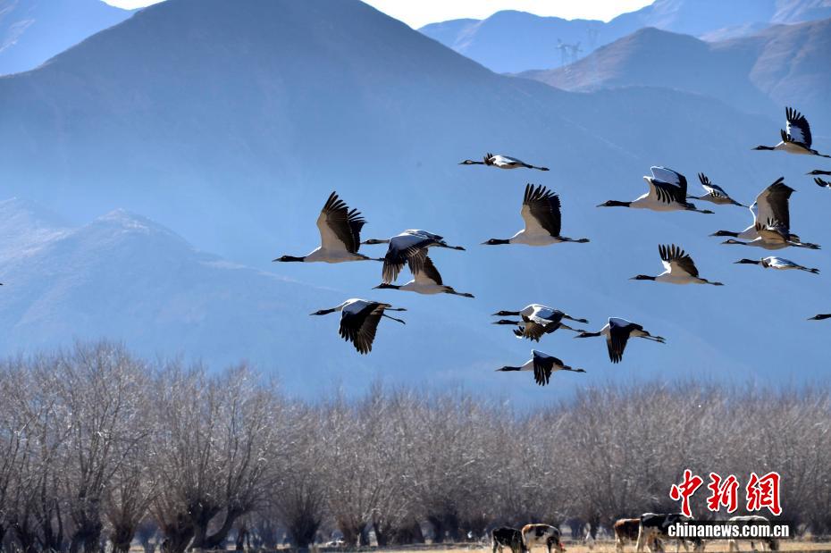 11月14日,西藏日喀則市桑珠孜區(qū)邊雄鄉(xiāng)越冬的黑頸鶴。黑頸鶴是全球十五種鶴類中唯一在高原地區(qū)繁殖和越冬的鶴類,屬中國國家一級(jí)保護(hù)動(dòng)物。每年10月中下旬左右,黑頸鶴陸續(xù)飛抵雅魯藏布江中游河谷等地越冬。它們漫步田間地頭、悠閑覓食,為雪域高原的冬日增添了一道靈動(dòng)的風(fēng)景線。中新社記者 李林 攝