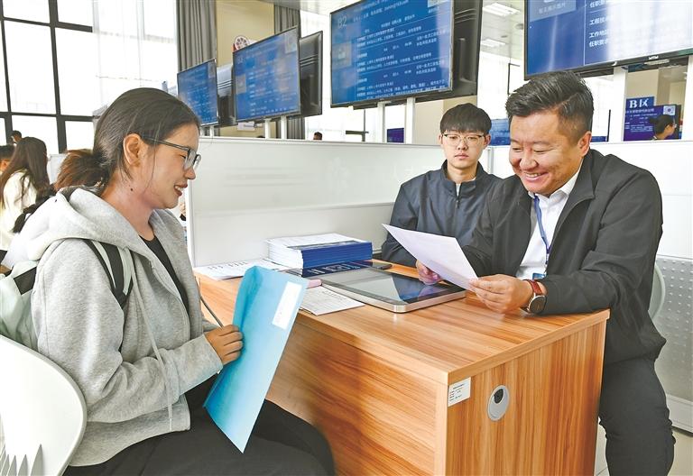圖為自治區(qū)就業(yè)服務(wù)中心舉辦的2025年全民數(shù)字素養(yǎng)與技能提升專場(chǎng)招聘會(huì)上,求職者在面試。記者 旦增蘭澤 攝