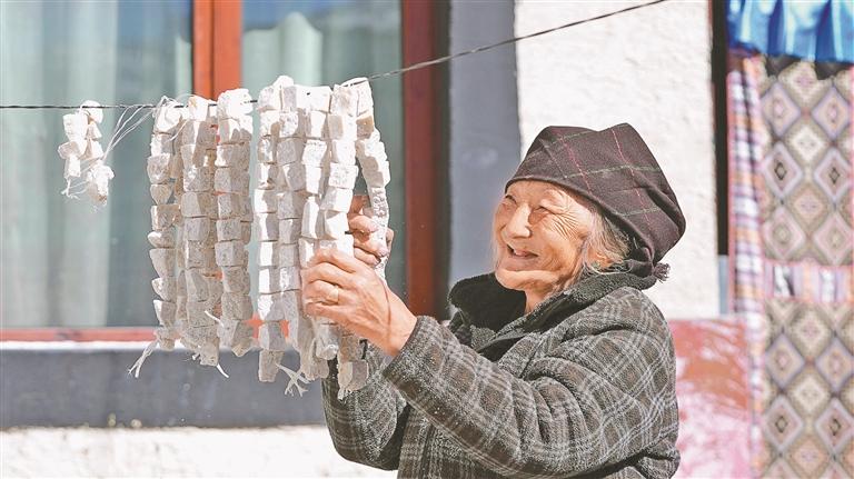 墨竹工卡縣日多鄉(xiāng)拉龍村一位老人在晾曬奶渣。記者 格桑倫珠 攝
