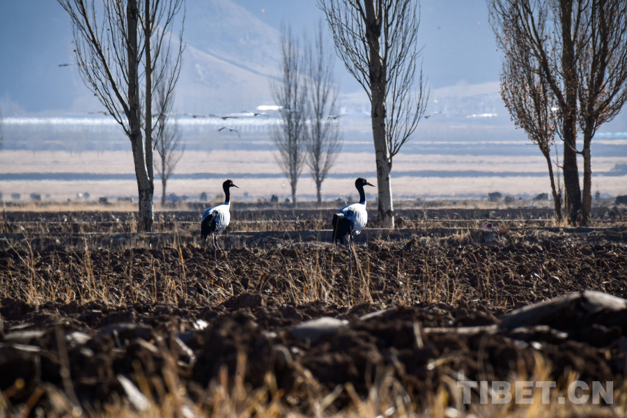 圖為拉薩市林周縣境內正在田野中覓食的黑頸鶴(攝于11月23日)攝影:趙振宇