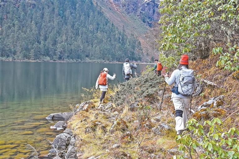 圖為游客在薩貢玉錯徒步旅游。記者 劉楓 攝