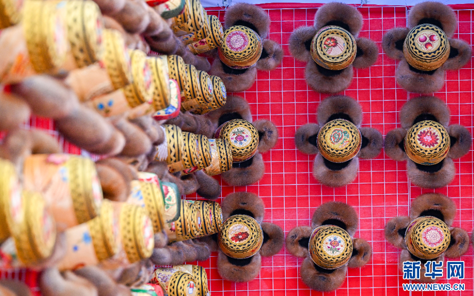 圖為西藏自治區(qū)山南市第45屆雅礱物資交流會上展示的金絲藏帽(12月1日攝)。新華網(wǎng) 旦增努布 攝