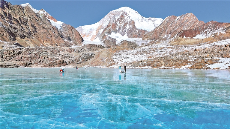 在友人的提議下,我仰面躺下。剎那間,刺骨的寒意在瞬息間由脊背侵入,高原的陽光慷慨地灑落全身,身體仿佛懸浮于冷與熱、天與地、剎那與永恒的交界,恍惚間,冰面澄澈的深處,似有熟悉的身影含笑走來,衣袂間拂動(dòng)著遠(yuǎn)古的風(fēng)。一切歸于遺忘,讓人分不清這是古是今。