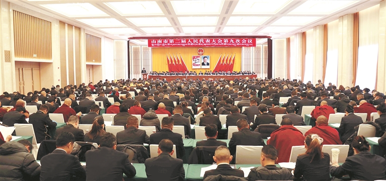 圖為山南市第二屆人民代表大會(huì)第九次會(huì)議現(xiàn)場(chǎng)。