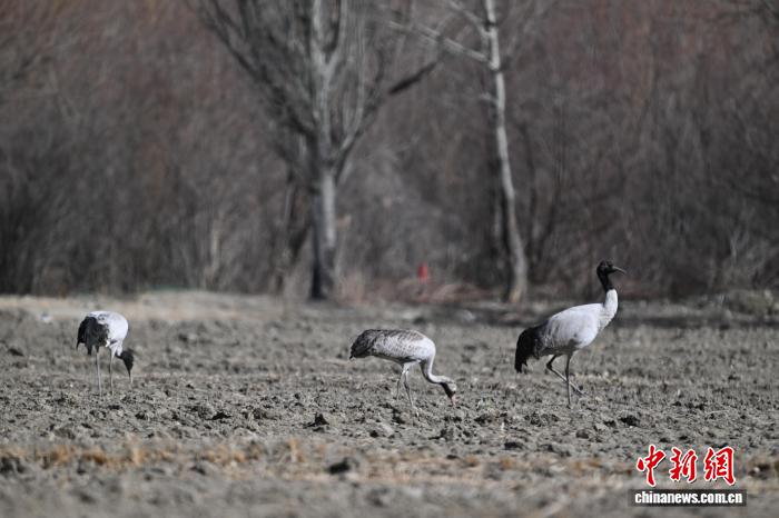 圖為山南市貢嘎縣境內(nèi),在田間覓食的黑頸鶴一家。中新社記者 貢嘎來松 攝