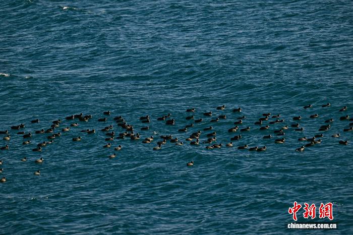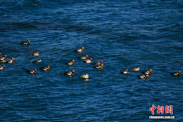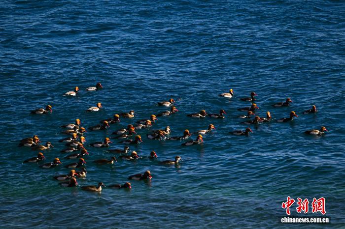 圖為在羊卓雍錯越冬的赤嘴潛鴨。中新社記者 貢嘎來松 攝
