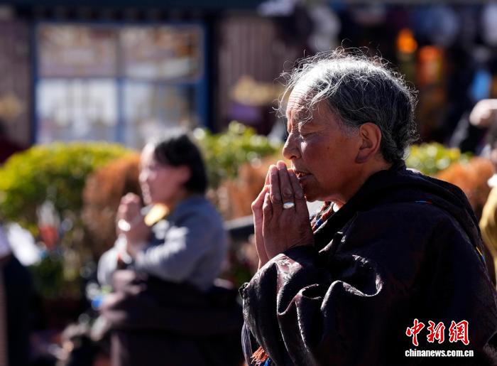 1月23日,西藏拉薩大昭寺外,信眾磕長頭。冬季高原進(jìn)入農(nóng)閑期,眾多藏傳佛教信眾從各地來到拉薩,沿布達(dá)拉宮、大昭寺等地轉(zhuǎn)經(jīng)、朝拜、祈福。中新社記者 李林 攝