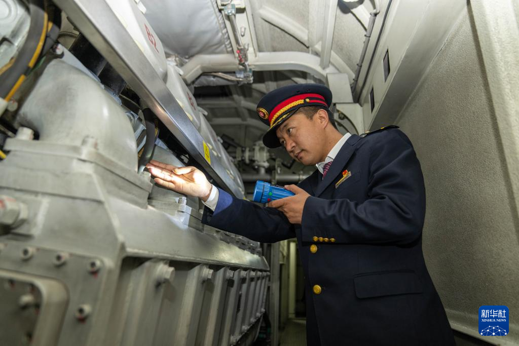 2月14日,斯朗旺扎在檢查機(jī)車(chē)機(jī)械間。新華社記者 旦增尼瑪曲珠 攝?