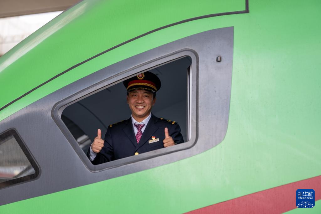 2月14日,斯朗旺扎和他駕駛的“復(fù)興號(hào)”動(dòng)車(chē)組留影。新華社記者 旦增尼瑪曲珠 攝